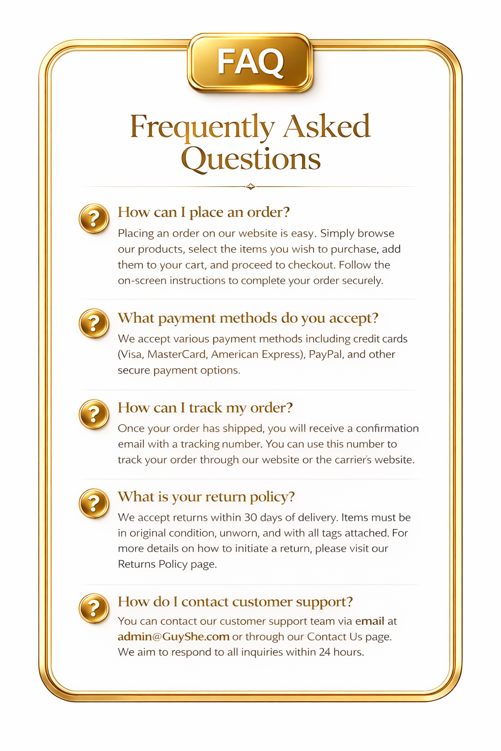 Welcome to GuyShe Online Shopping! Our FAQ section is designed to give you a clear understanding of who we are, what we offer, and how to get the best shopping experience possible. Founded on June 4th, 2024, GuyShe was created to deliver a modern, reliable, and premium online shopping destination for men, women, teens, and families worldwide.